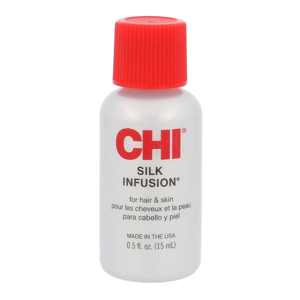 Die einzigartigen regenerativen Eigenschaften der Haarernährung Farouk Systems CHI Silk Infusion bestehen in enthaltenen Aktivstoffen, zu denen auch Naturseide-Teilchen, Keratin, Vitamine, Pflanzenextrakte und Soja-Proteine gehören. Der Siedenexktrakt verbessert die geschmeidigkeit des Haars und kräftigt die Haarwurzeln. Das Präparat ist alkoholfrei.